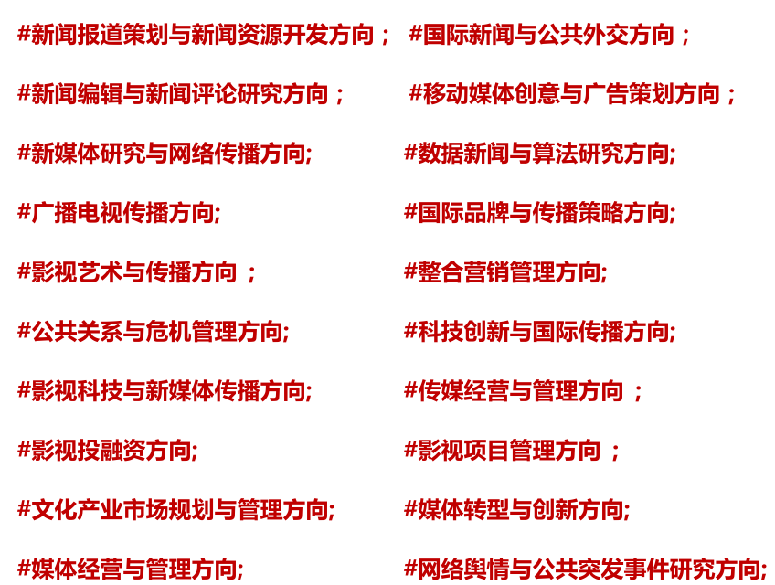 专业课:公关理论与实务,网络传播研究,传媒经济研究,视觉传播研究,网络舆情研究,数据新闻与数据可视化研究、量化传播研究方法,媒介市场分析。